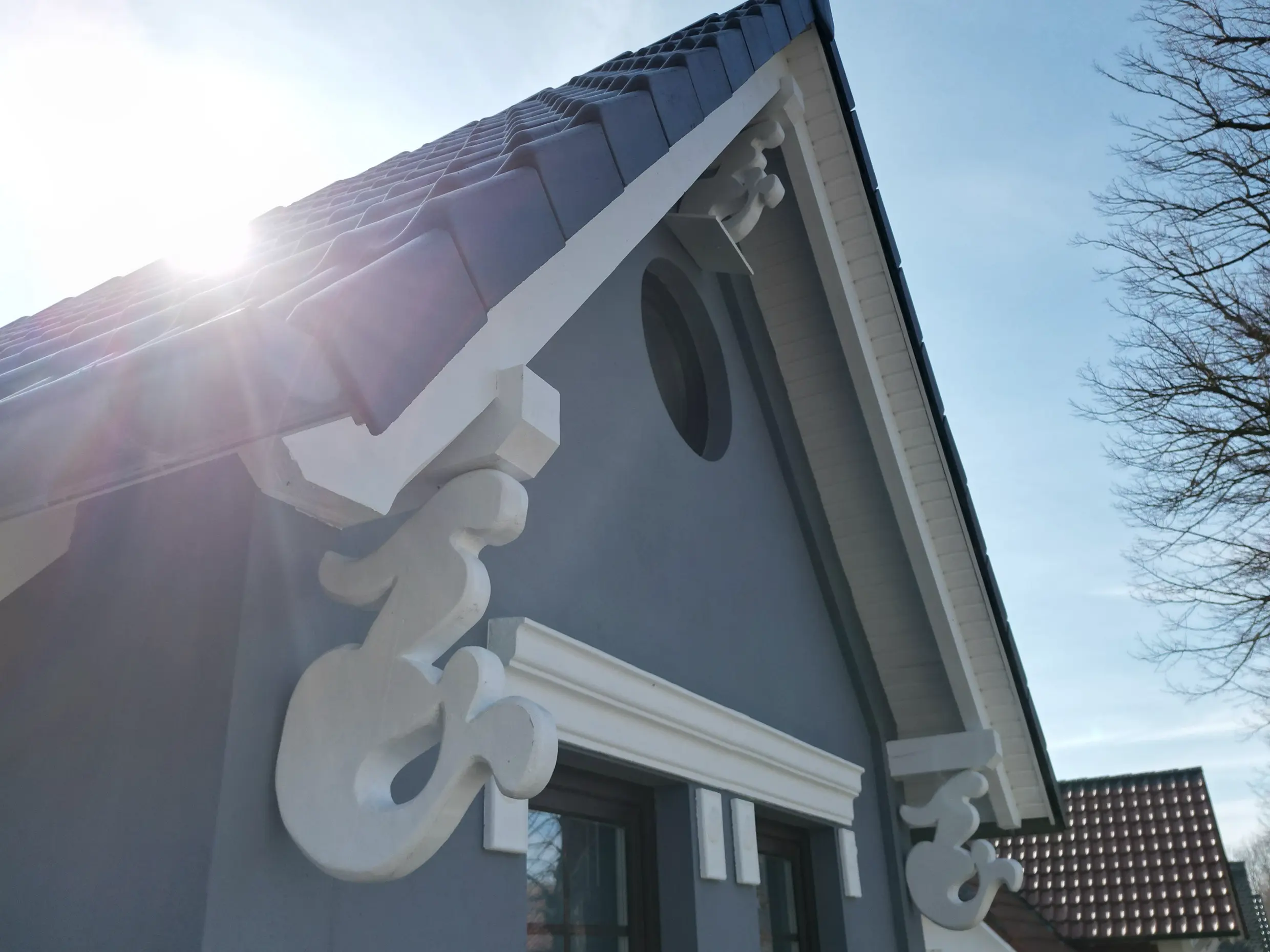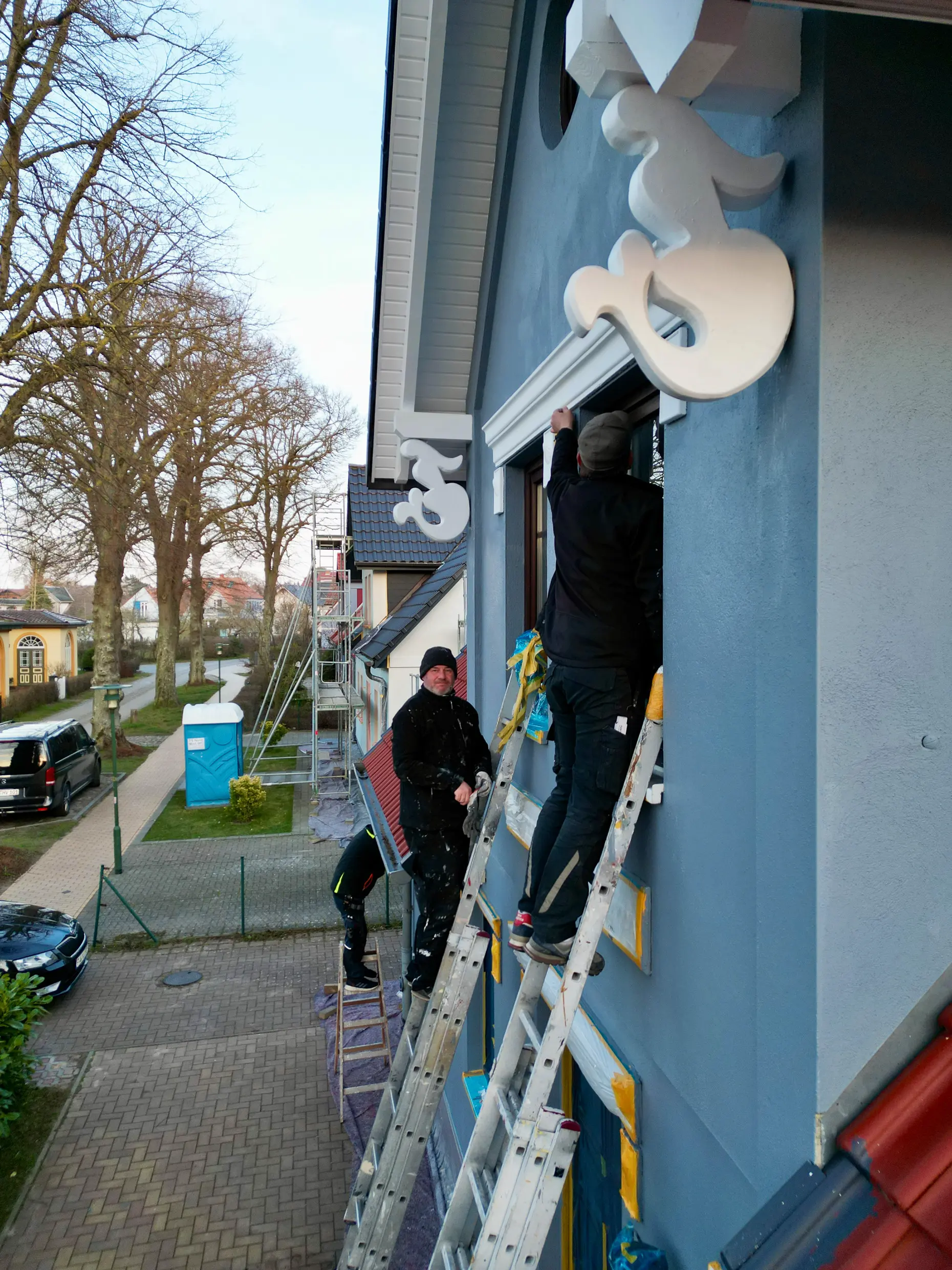 Mehr zur FassadenbeschichtungFür ein rundum harmonisches Erscheinungsbild wurden alle Stuckelemente sorgfältig ausgebessert und in einem frischen Weißton gestrichen, der einen wunderschönen Kontrast zur eleganten Fassadenfarbe bildet.