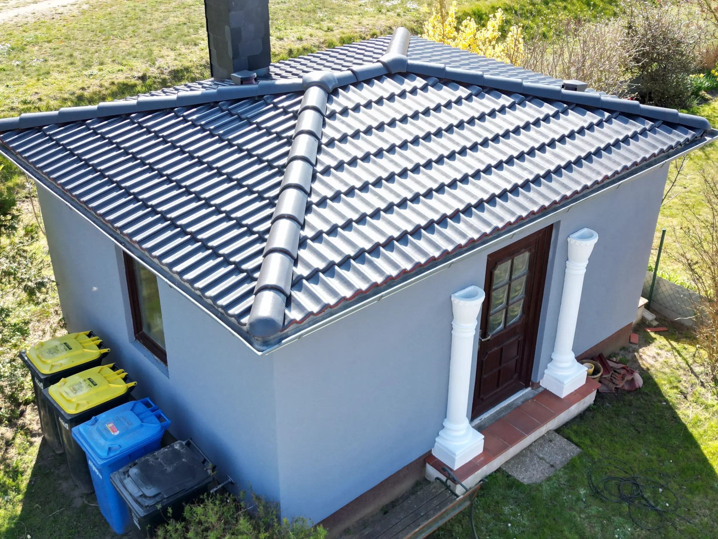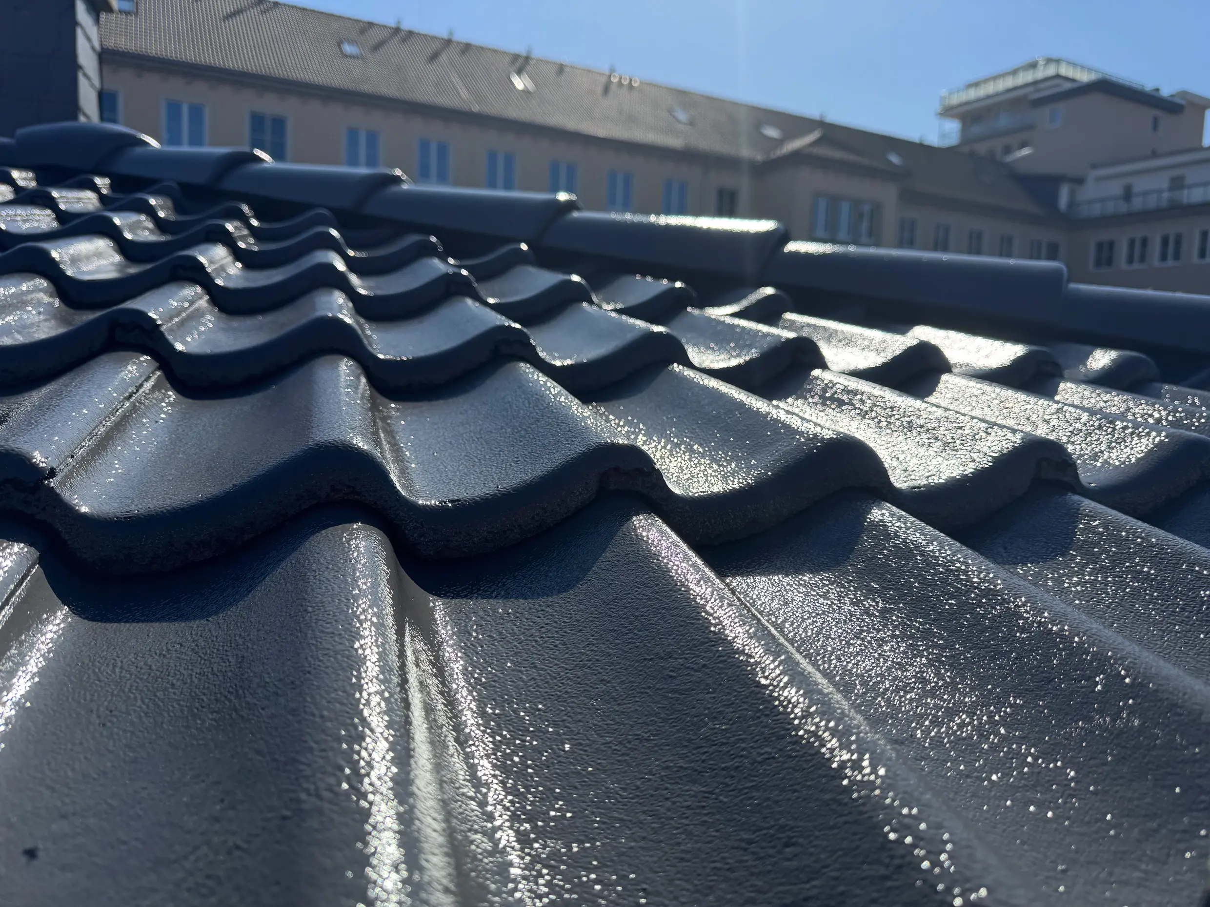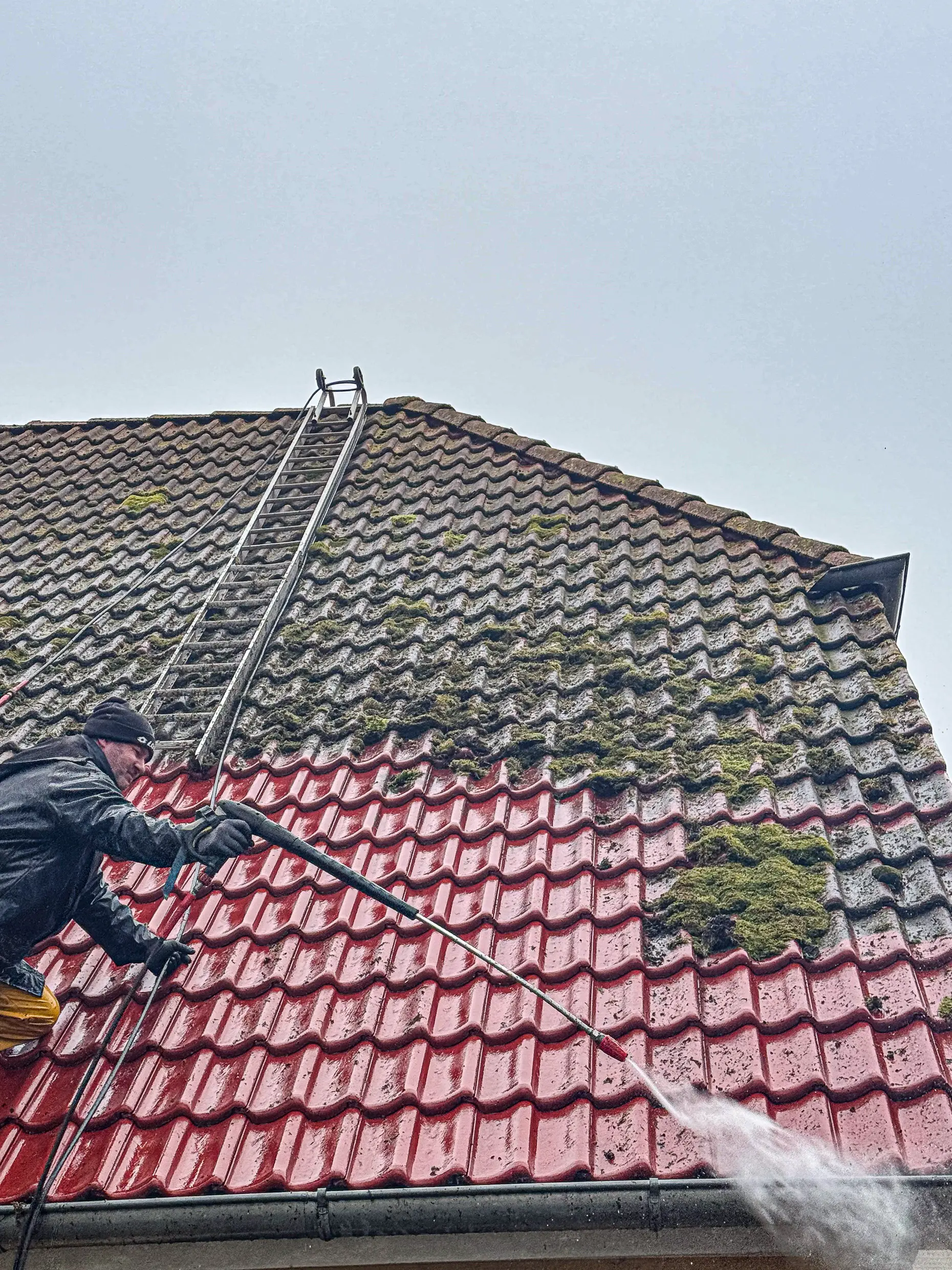 Den Anfang machte eine intensive Hochdruckreinigung mit folgender Desinfektion. Dabei wurden alle beschädigten Ziegel sorgfältig ausgetauscht, anstatt gleich das komplette Dach neu einzudecken. Nach einer tiefenwirksamen Grundierung folgten zwei Schichten der hochwertigen NowoCoat Dachfarbe aus Dänemark - ein Premium-Produkt, das speziell für das raue Küstenklima entwickelt wurde. Der ausgewählte Farbton "Anthrazit glänzend" verlieh dem Dach einen zeitgemäßen, edlen Look.