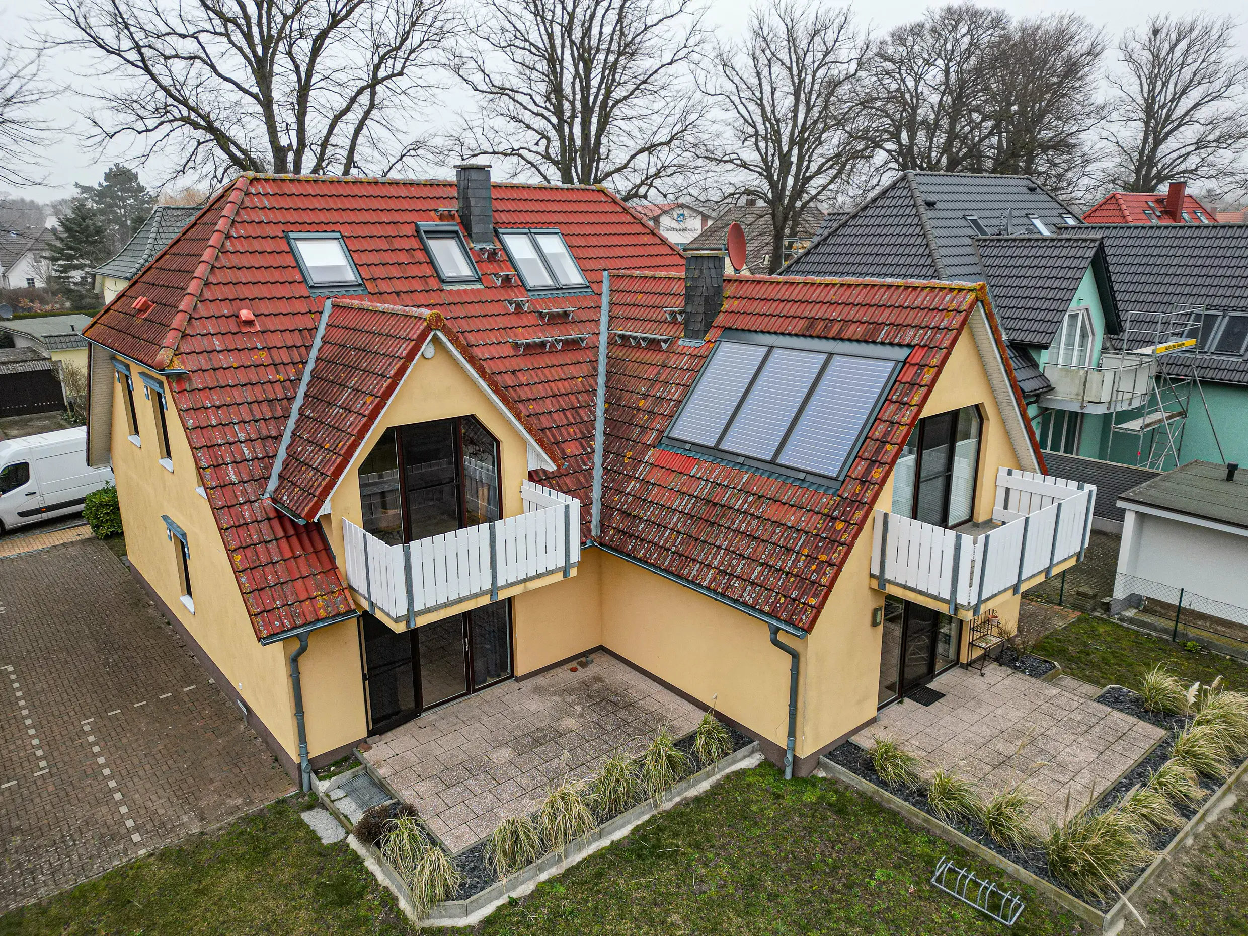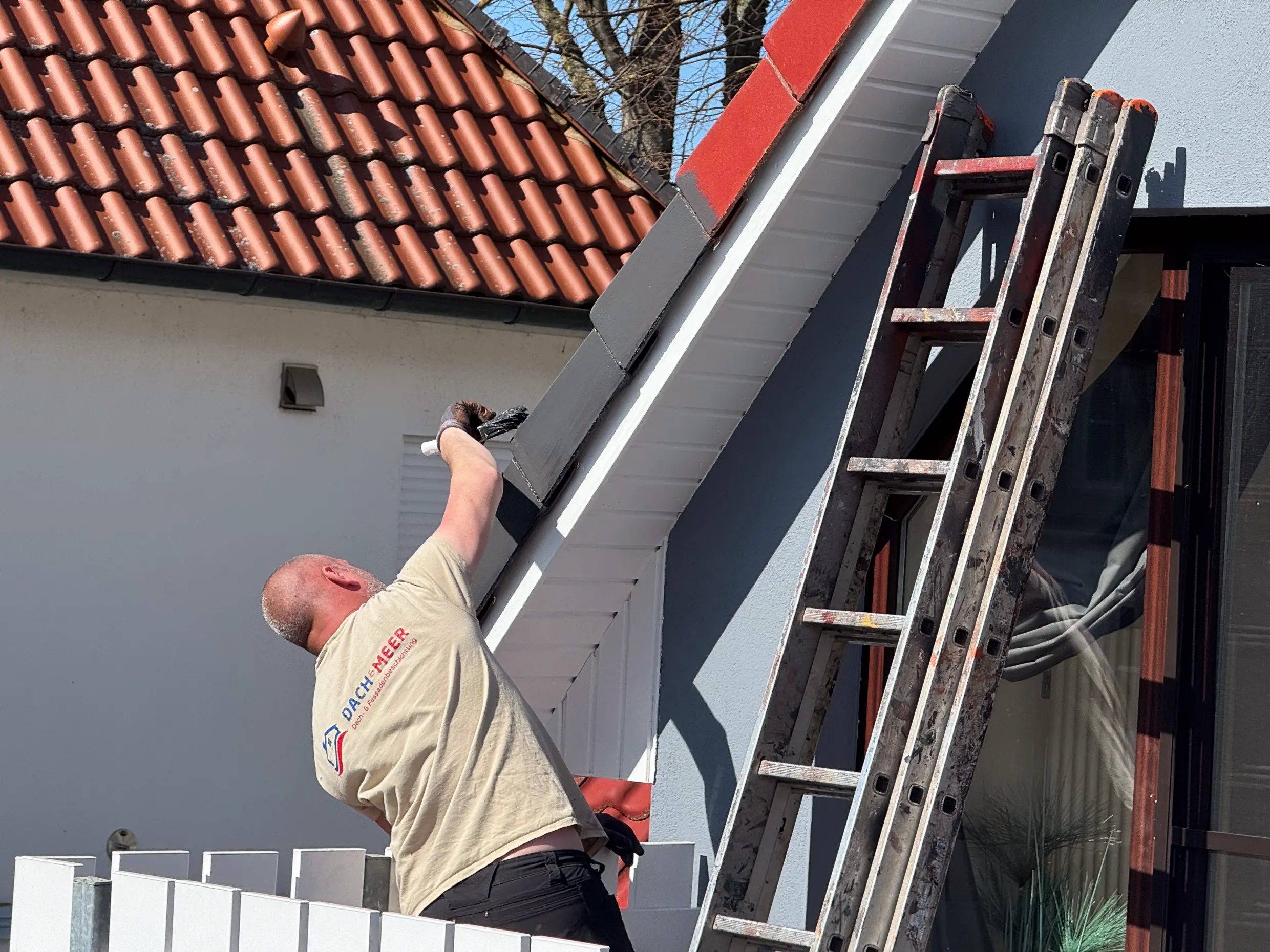 Mehr zur DachbeschichtungDie Fassade erhielt nach gründlicher Reinigung und Desinfektion eine fachgerechte Behandlung der Risse. Nach einer speziellen Grundierung folgte eine zweifache Beschichtung mit Caparol Thermosan NQG. Dieses High-End-Produkt nutzt intelligente Nanotechnologie, um aktiv gegen erneuten Algen- und Schmutzbefall zu wirken - perfekt für ein Haus in direkter Küstenlage.