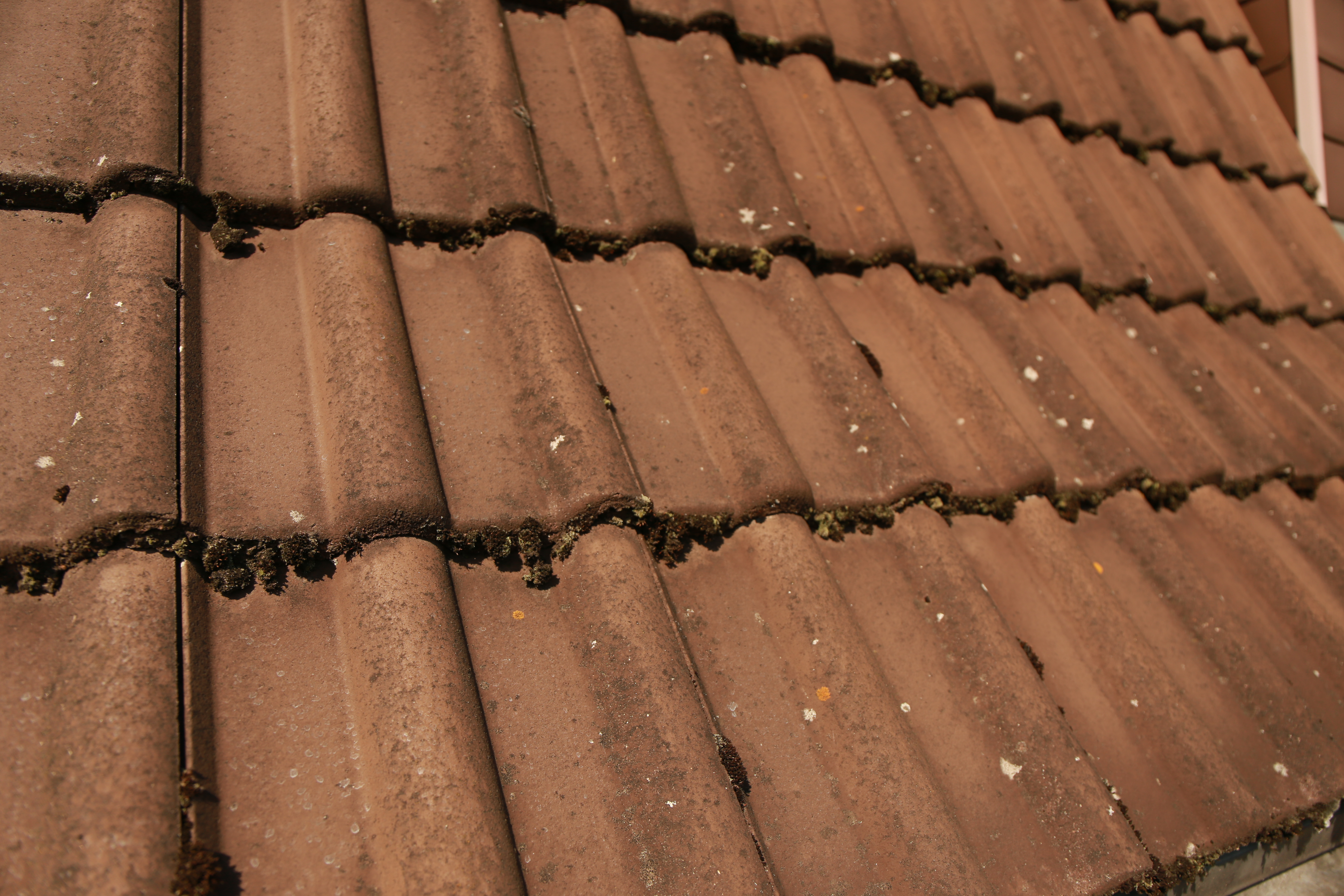 Das Dach war zu diesem Zeitpunkt über 40 Jahre alt. Die ursprüngliche Beschichtung hatte sich vollständig gelöst, die Poren des Ziegels lagen offen, alles wirkte rau und stark gealtert. Dazu kamen Moose, Flechten und jahrzehntelange Witterungsspuren.