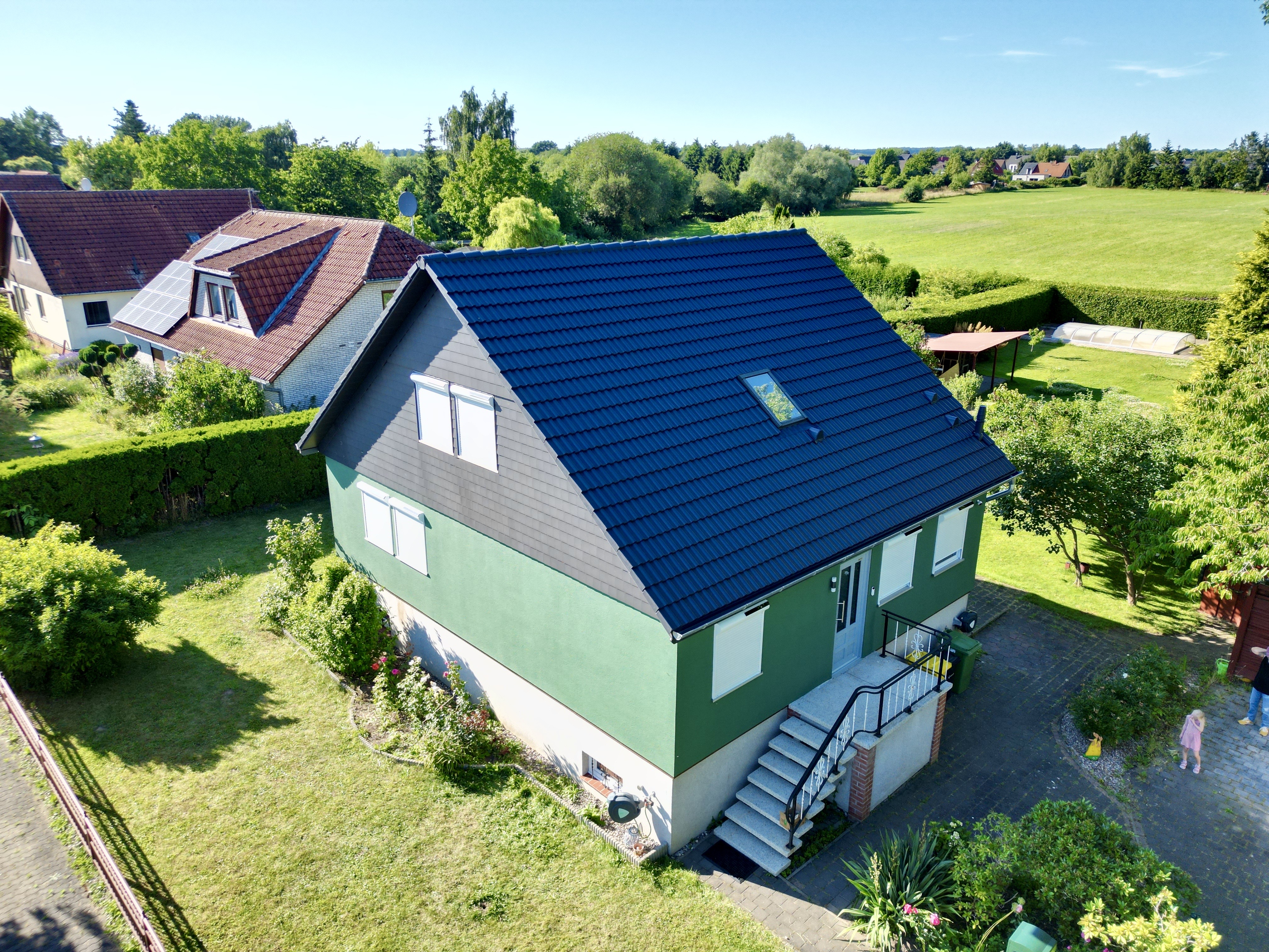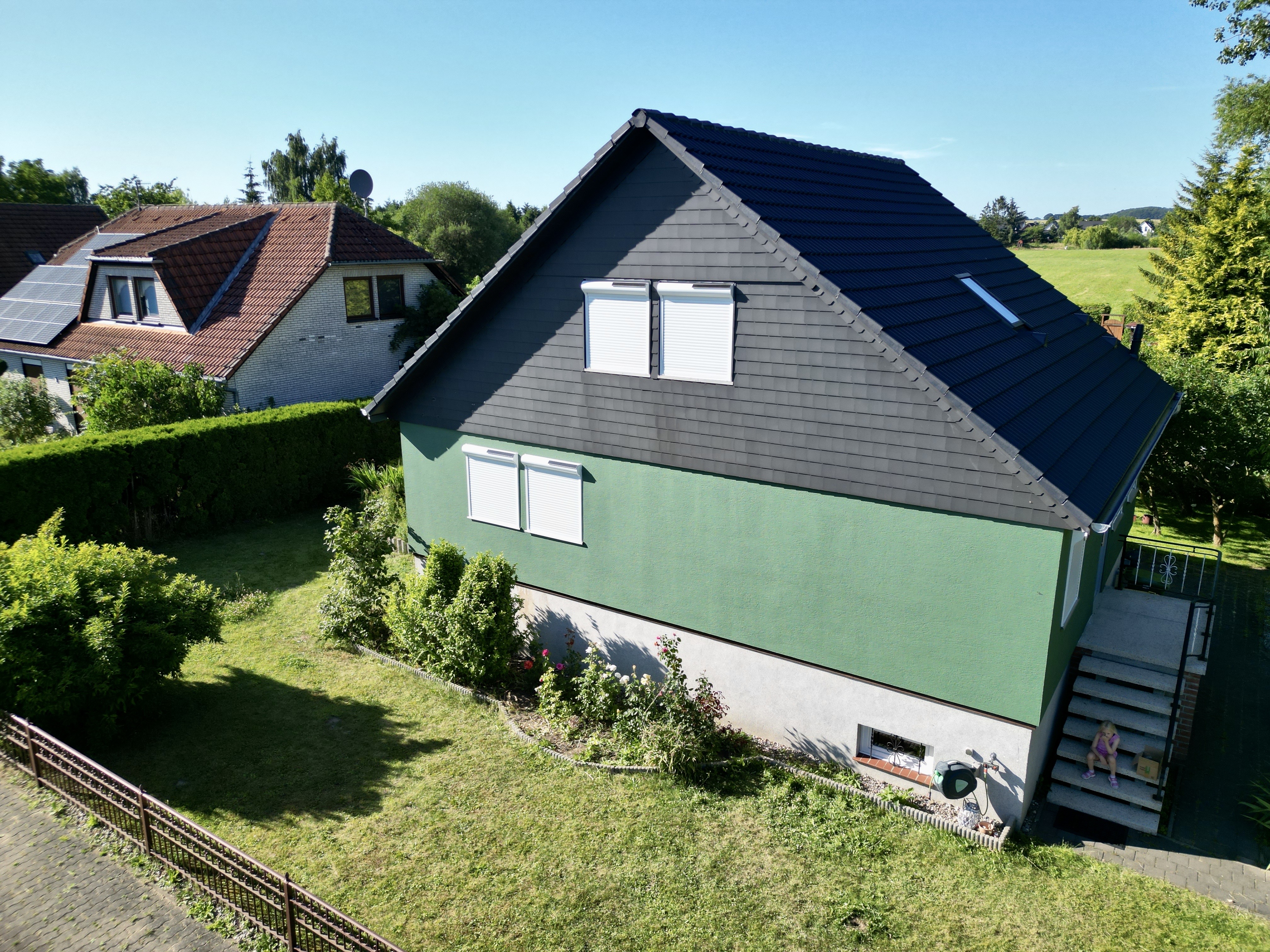 Satte grüne Fassade, anthrazitfarbenes Dach