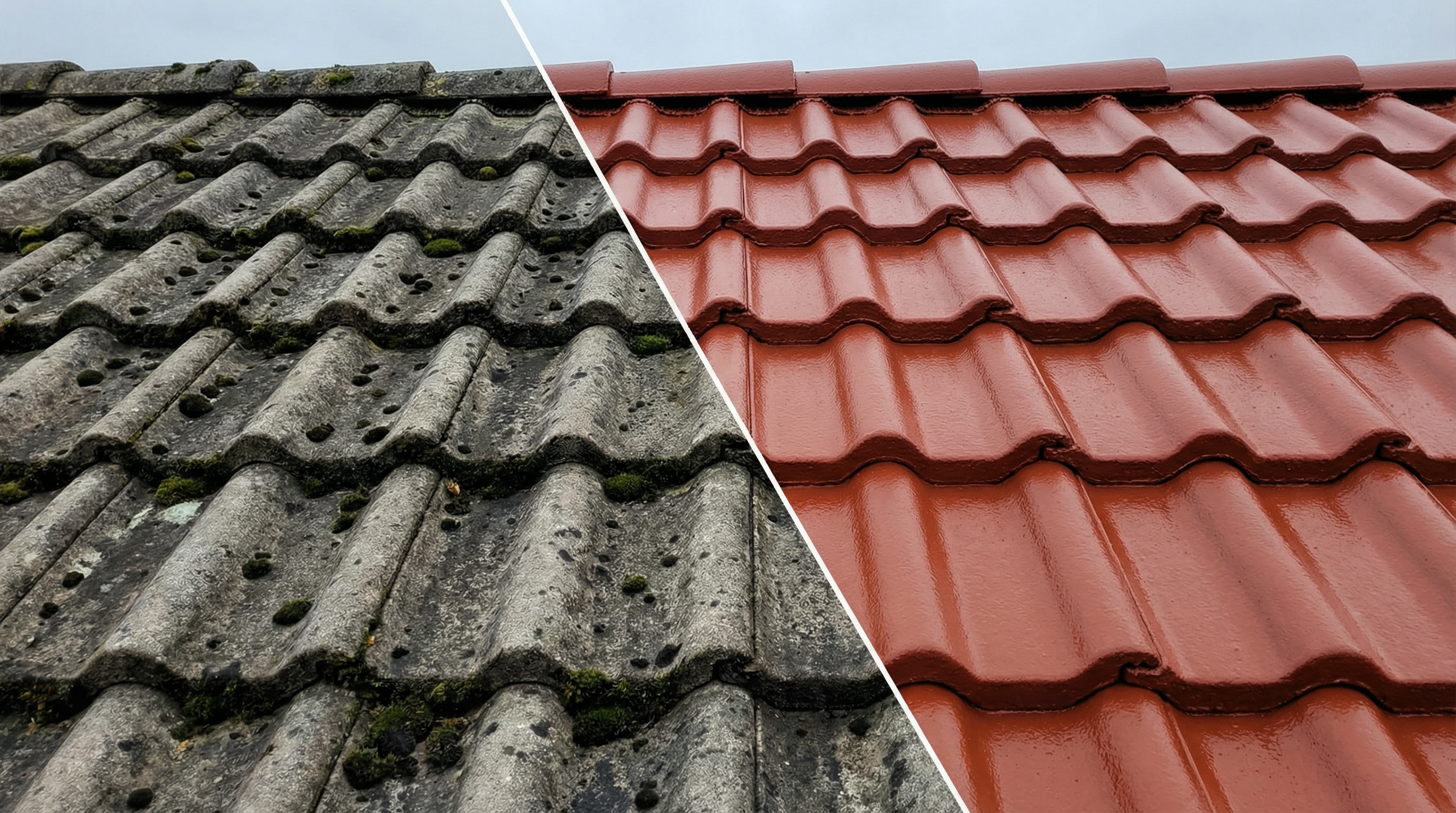 Moos, Algen und Schmutz werden gründlich entfernt - schonend für Ihre Dachziegel und umweltbewusst mit biologisch abbaubaren Mitteln.