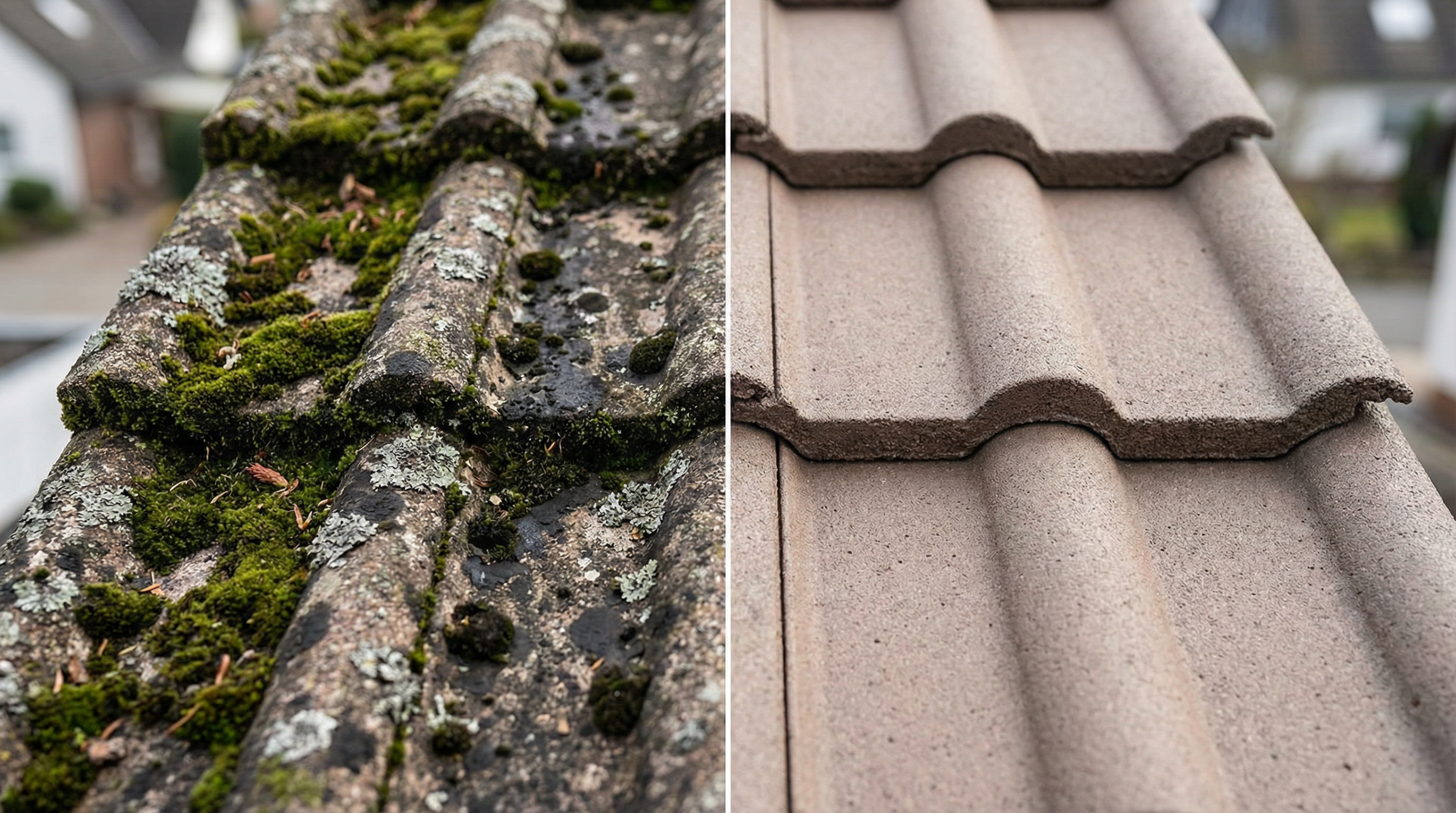 Moos hält Feuchtigkeit auf dem Dach. Bei Frost kann diese Feuchtigkeit die Ziegel beschädigen. Rechtzeitige Reinigung verhindert teure Schäden.