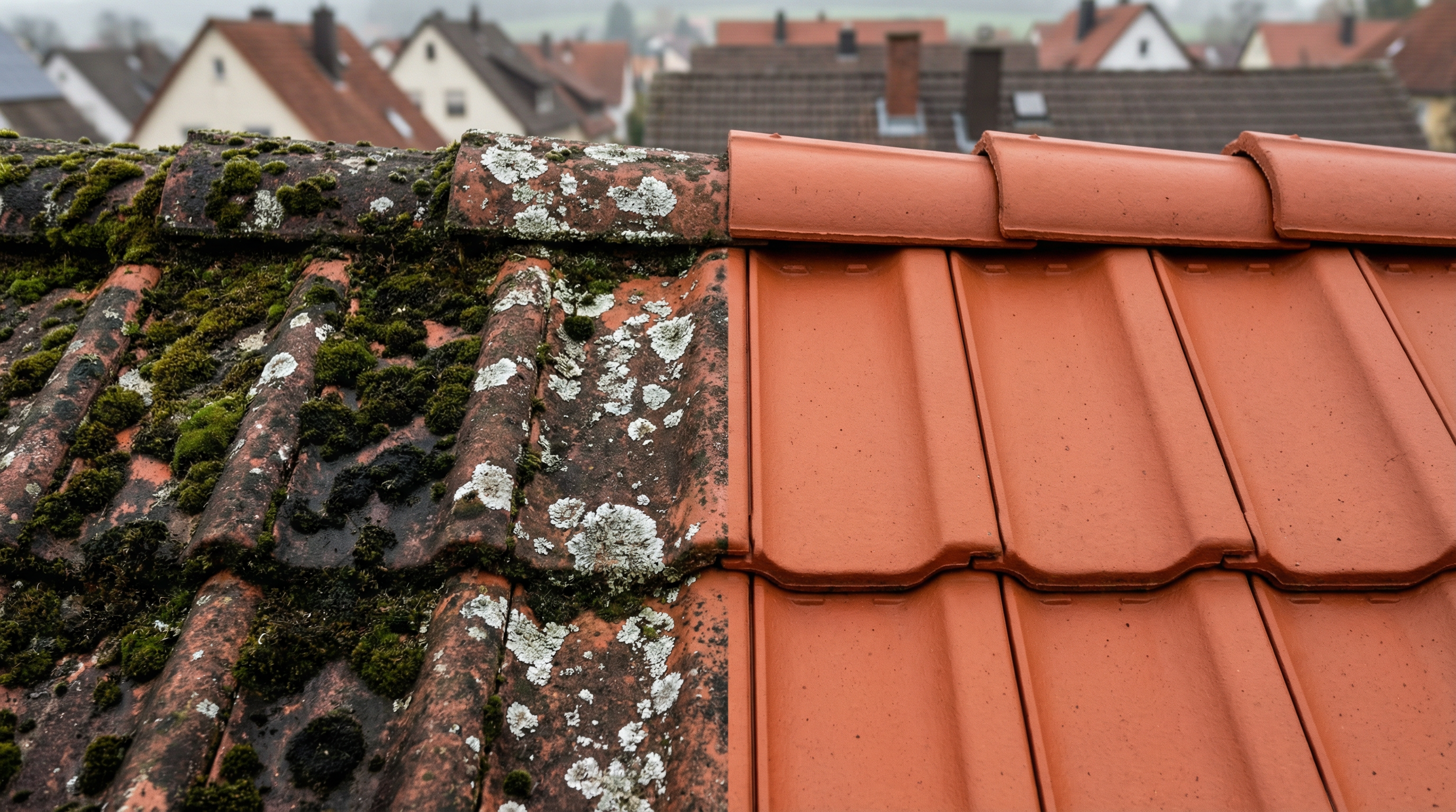 Mit unserer schonenden Niederdrucktechnik entfernen wir Moos, Algen und Verschmutzungen - ohne die Dachziegel zu beschädigen. Dachrinnenreinigung ist inklusive.