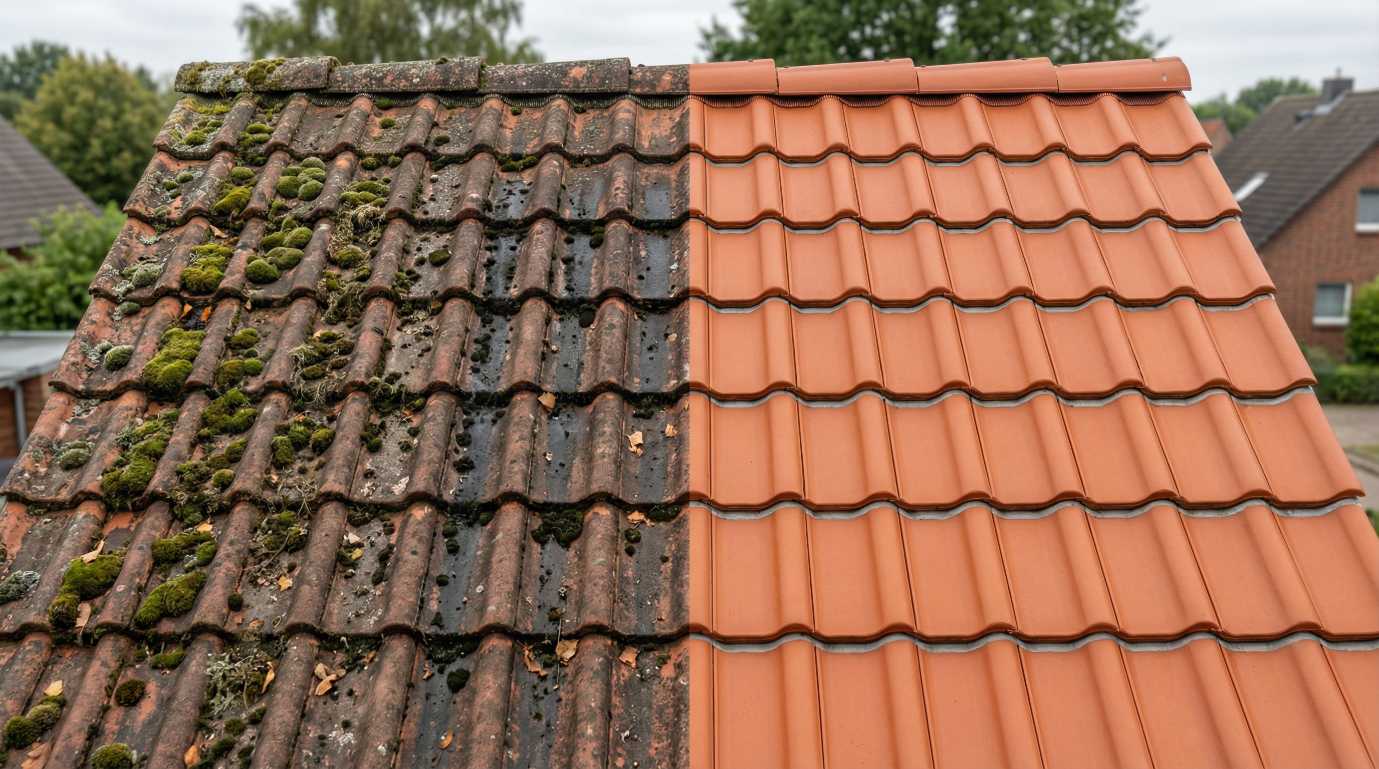 Moos hält Feuchtigkeit auf dem Dach. Bei Frost kann diese Feuchtigkeit die Ziegel von innen sprengen. Rechtzeitige Reinigung verhindert teure Schäden.