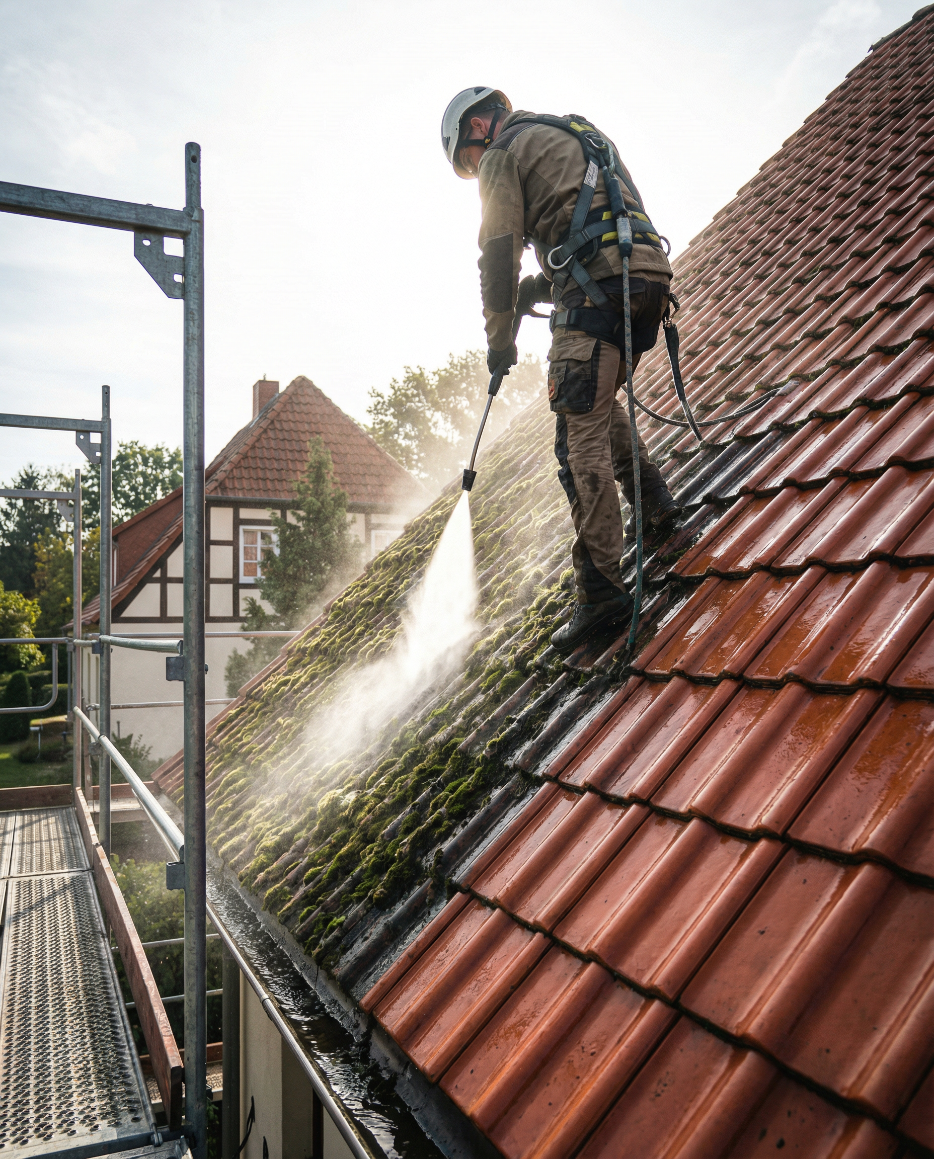Mit professionellen Hochdruckreinigern bei angepasstem Druck entfernen wir Moos, Algen, Flechten und Schmutz vollständig. Das Ergebnis ist sofort sichtbar.